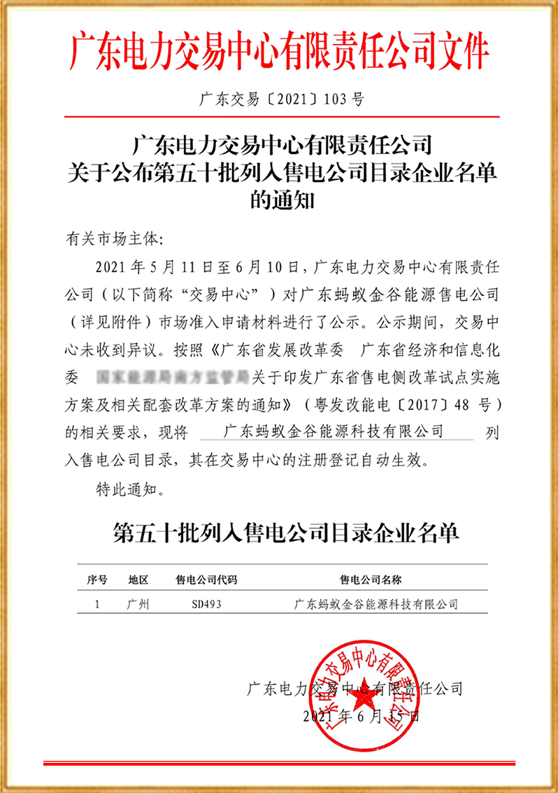 廣東螞蟻金谷能源科技有限公司是螞蟻鯨鵬能源集團下屬全資子公司,借助集團強大的技術(shù)和市場資源,逐步夯實自身基礎(chǔ),配備壯大員工團隊,總部員工超50人,服務(wù)客戶超過2500家,常年位列民營售電公司前三,交易電量約150億度,累計為用戶節(jié)省電費超過5億元,榮獲廣東電力交易中心AAA信用評級。